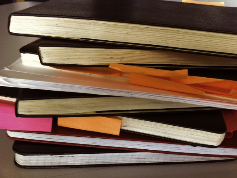 Καταρχήν θα πάρω αυτό εδώ το μικροσκοπικό τετραδιάκι. Πάντα κουβαλάω ένα, γιατί σχεδόν πάντα οι ιδέες με βρίσκουν εκεί που δεν το περιμένω! Ενώ όταν τις περιμένω… περιμένω!!! Αυτή η συνήθεια με τα moleskines μου είχε κολλήσει από τότε που με θυμάμαι στη διαφήμιση! Σχεδιάζω τις ιδέες μου στα μαύρα, μακρόστενα κατά προτίμηση, τετραδιάκια. Δείτε αυτά, για του λόγου το αληθές: