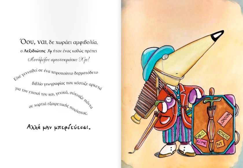 Αν ήξερες πόσο μεγάλος είναι ο κόσμος μας, θα σκεφτόσουν πως είναι αδύνατον να τον γυρίσεις ολόκληρο. Αυτά πίστευα κι εγώ όταν ήμουν στην ηλικία σου, μέχρι που πετάχτηκε μπροστά μου… ο Λεξιδιώτης Χμ! Χάρη σ’ αυτόν έμαθα πως οι λέξεις δεν είναι απλώς λέξεις, αλλά μικρά, καλογραμμένα μέσα μεταφοράς, όπως τα τρένα και τα αεροπλάνα, που σε «λεξιδεύουν» σε τόσα και τόσα μέρη. Σήμερα, περισσότερο από ποτέ, πιστεύω πως τα καλύτερα ταξίδια… μετά τα ταξίδια, είναι αυτά που στη γλώσσα των Χμ λέμε… λεξίδια!!!