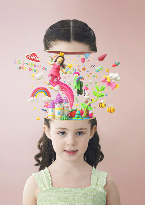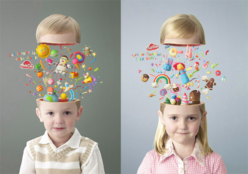 Πολλοί θεωρούν αποκρουστικές αυτές τις καταχωρίσεις. Κομμένα παιδικά κεφάλια και μυαλά που πετάγονται σε κομμάτια φτιαγμένα από πλαστελίνη! Χμ… Εμένα από την άλλη, αυτές οι εικόνες μου φαίνονται ιδιαίτερα ευχάριστες και απόλυτα στοχευμένες. Τι άλλο έχουν στο κεφάλι τους τα παιδιά αν όχι πολύχρωμες ιδέες που θέλουν να πεταχτούν από κει μέσα και να βγουν στον κόσμο και μάλιστα, πλασμένες απ’ τα χεράκια τους; Μια ευφυής οπτικοποίηση της παιδικής φαντασίας, με πρωταγωνιστή το ίδιο το προϊόν που διαφημίζει! Αναρωτιέμαι τι λένε τα παιδιά. Εξάλλου, γι’ αυτά φτιάχτηκε η διαφήμιση!